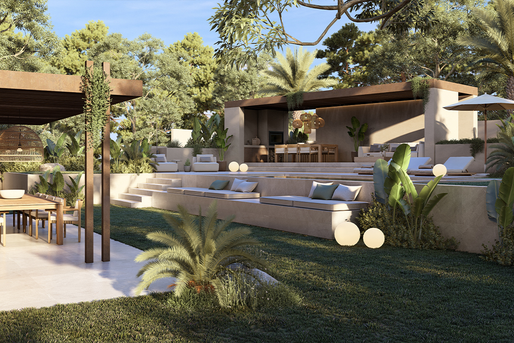 La propiedad contará con una gran piscina rodeada de un exuberante jardín mediterráneo, zona de barbacoa y espacios exteriores ideales para disfrutar del agradable clima mallorquín.
